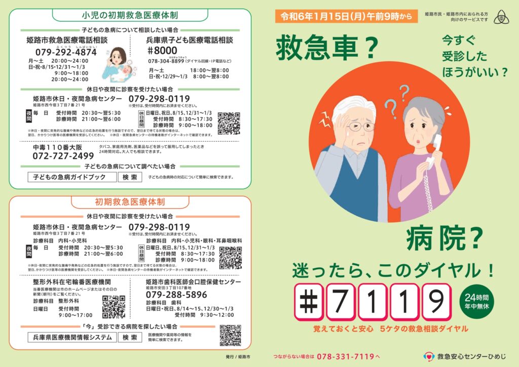 休日や夜間に診察を受けたい場合は、姫路市休日・夜間急病センターがあります。受診の前に、必ず年末年始の診療時間等ご確認下さい。年末年始は非常に混み合います。救急医療は限りある医療資源で成り立っています。緊急性の高い方が適切な医療を受けられるよう、不急不要な受診をお控え下さいますよう、ご理解とご協力お願いします。